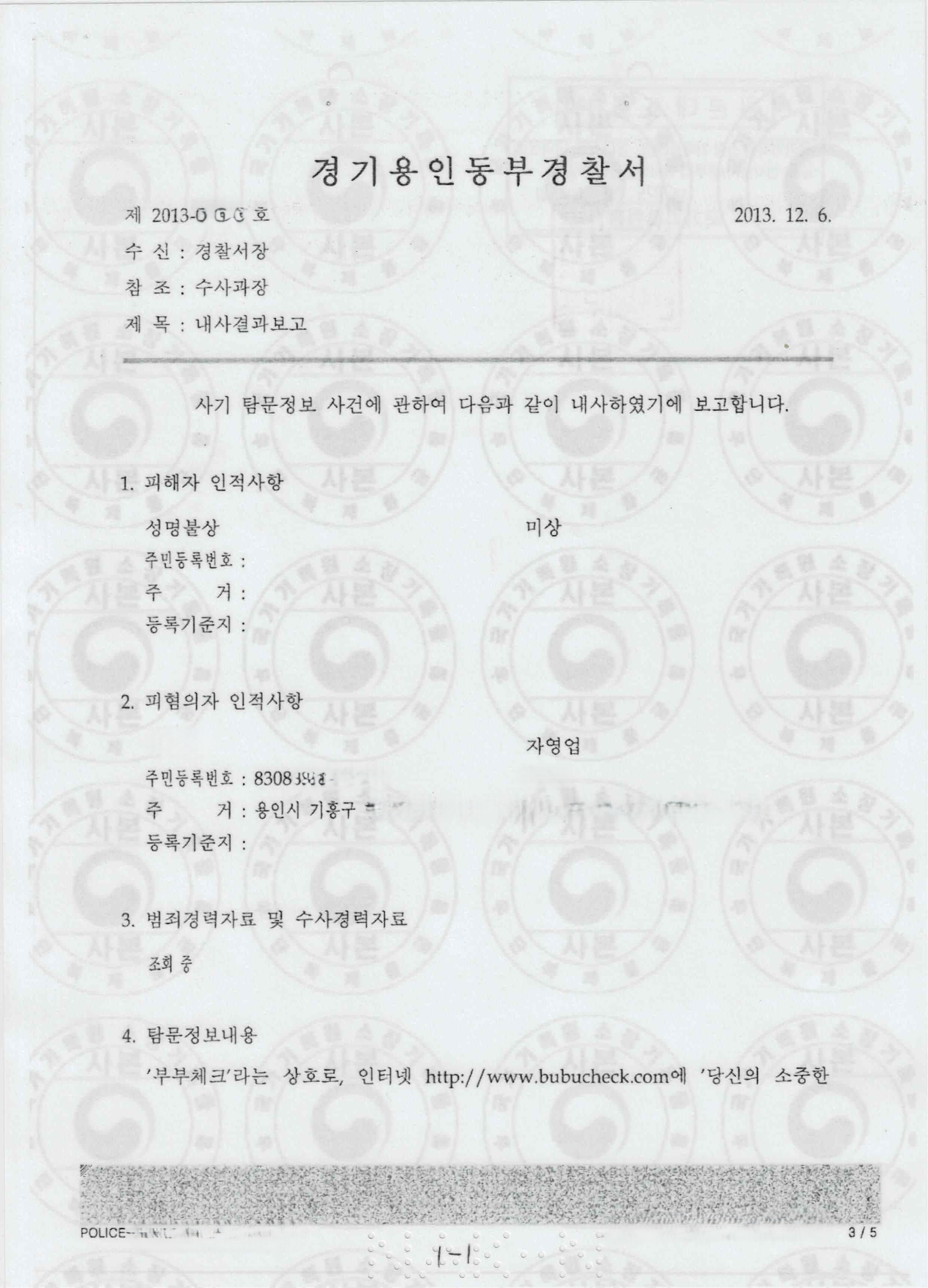 일부 동종 또는 유사한 제품을 판매하는 업체에서 부부체크 제품이 정확하지 않다고 허위 사실을 유포하는 행위를 적극적으로 대응하고 있습니다. 아래 내용은 개인 정보를 지운 내용의 문건입니다. 이는 부부체크가 직접 경찰 조사를 받고 아래와 같은 결과를 얻은 것입니다. 정액검출 시약의 경우 공식적으로 수사를 받아 부부체크 처럼 혐의가 없음을 받은 업체는 국내에서 존재하지 않고 있습니다. 또한 기존 가짜 제품들에 대한 기사 내용도 정정 또는 삭제를 요청할 예정이며 향후 저희 제품이 가짜라고 허위 사실로 본인들의 제품을 홍보하는 업체에 대해서는 강력한 대응을 할 예정입니다.